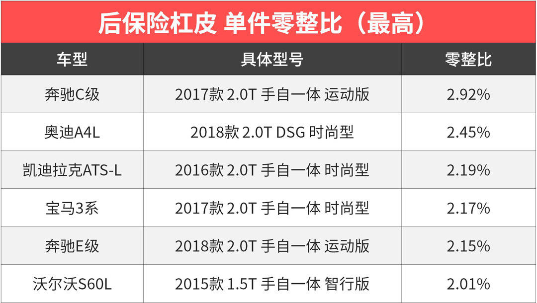 而在后保险杠皮单件零整比板块中,由于豪华品牌车型多数采用铝合金、玻璃钢等高质材料,相比普通品牌车型采用的ABS工程塑料材质明显造价更高,因此在后保险杠皮单件零整比板块的“头部”,几乎都是豪华品牌车型的身影。