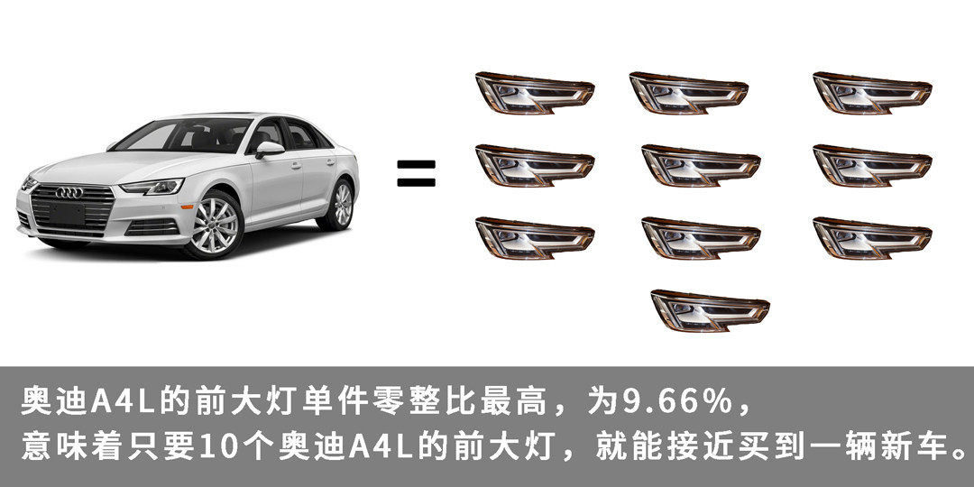 而后是单件零整比,包括前大灯单件零整比以及后保险杠皮单件零整比,在前大灯单件零整比板块中,奥迪A4 2018款 2.0T DSG 时尚型以9.66%的零整比占据第一的位置,结合其34.29万的官方指导价,奥迪A4一个前大灯的维修价格就超过了3.2万。
