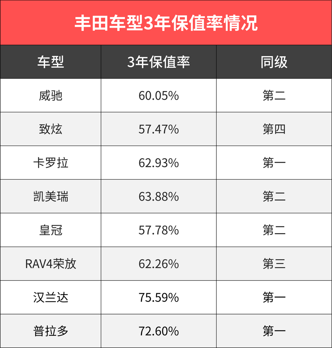 这一点同样反映在保值率上。在中国汽车金融暨保值率研究委员会发布的《2019年中国汽车保值率报告》中,丰田各级车型的3年保值率都名列前茅。对于消费者来说,这意味着以后出手的时候损失更小。
