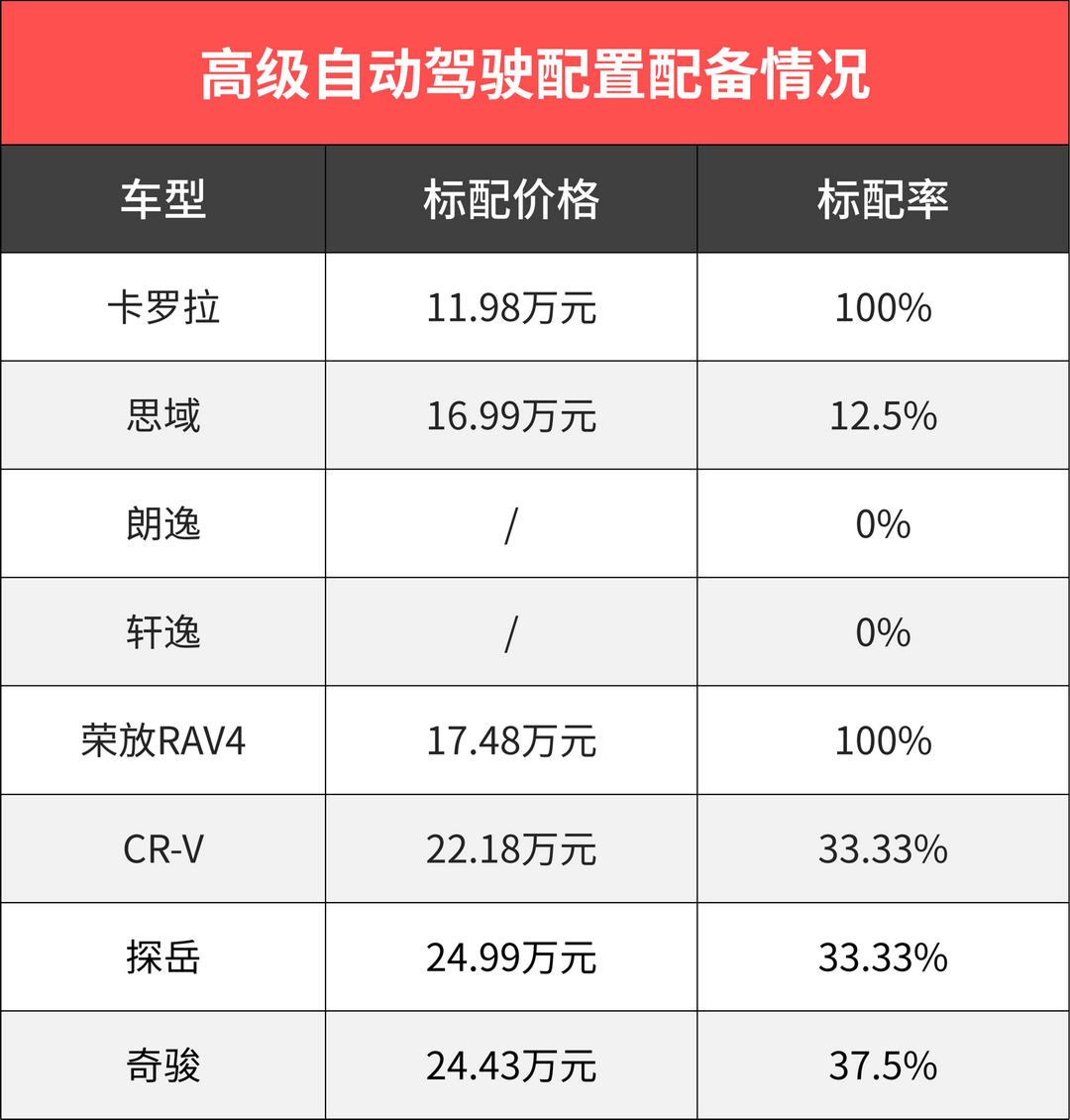 而在其他品牌身上,要配备ACC自适应巡航、预碰撞安全系统、车道保持辅助等系统,要么没有,要么只有在顶配或次顶配身上才有。