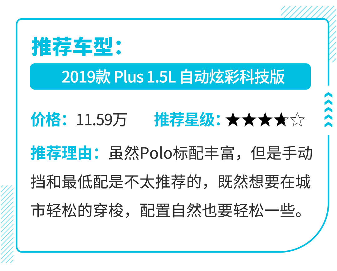 Polo Plus并不是最强的“买菜车”,动力也才113Ps;Polo Plus的空间虽有加长,但空间表现仍旧中规中矩。但是,对于一辆代步车而言,它做到了该有的水准。1.5L+6AT组合,加速流畅、动力直接,而且还省油;方向盘转向手感适中,在城市穿梭方便自如;配置非常丰富,“入门即高配”的它不用太纠结于预算;最重要的是,它拥有着原汁原味的德系传承,出色的做工让驾驶者感觉到了品质和德国“韵味”。