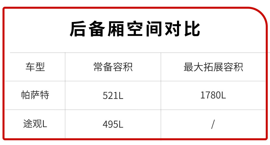 但从实际看来,同一级别的SUV比起轿车并未有优势。例如帕萨特与途观L,帕萨特的后备厢常备容积为521L,而途观L的常备容积仅有495L。