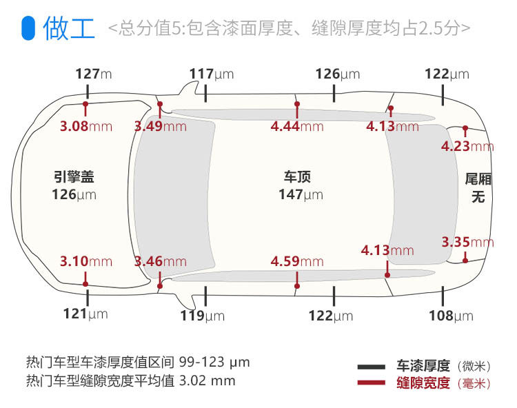 做工方面,冠道的车漆厚度比较均匀,整体的表现达到了目前主流车型的水准;而在车身缝隙的控制方面,整体的数值偏大,车身上下的缝隙均超过3mm,但是作为一款尺寸较大的中型SUV来说也情有可原。