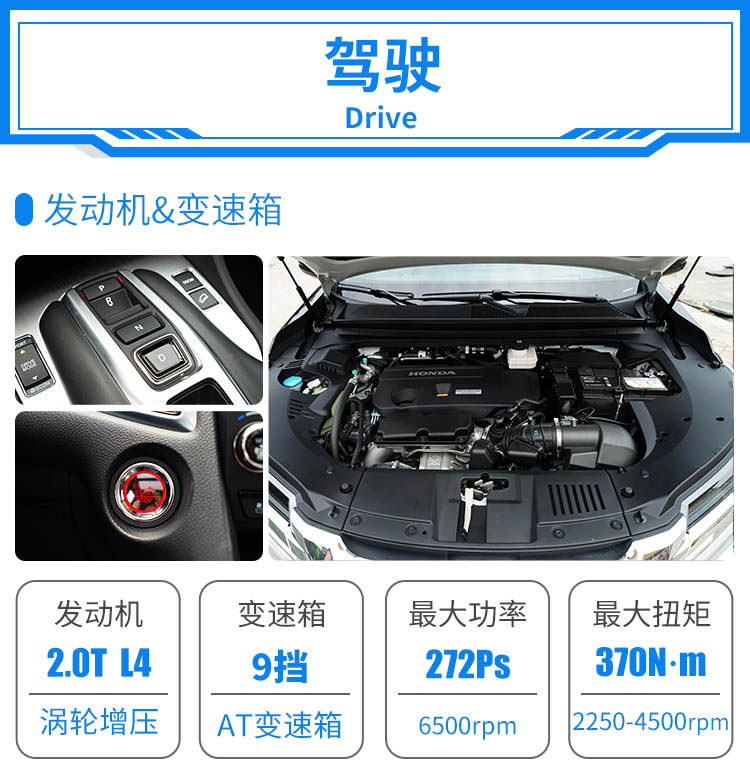 本田冠道一共有两个动力版本,分别由1.5T和2.0T两款发动机组成。本次测试的2.0T车型,最大272匹马力,峰值扭矩370牛·米,匹配的是9AT变速箱。冠道的动力相较于同级别车型来说高出不少,本田在动力方面一直有着比较出色的表现。
