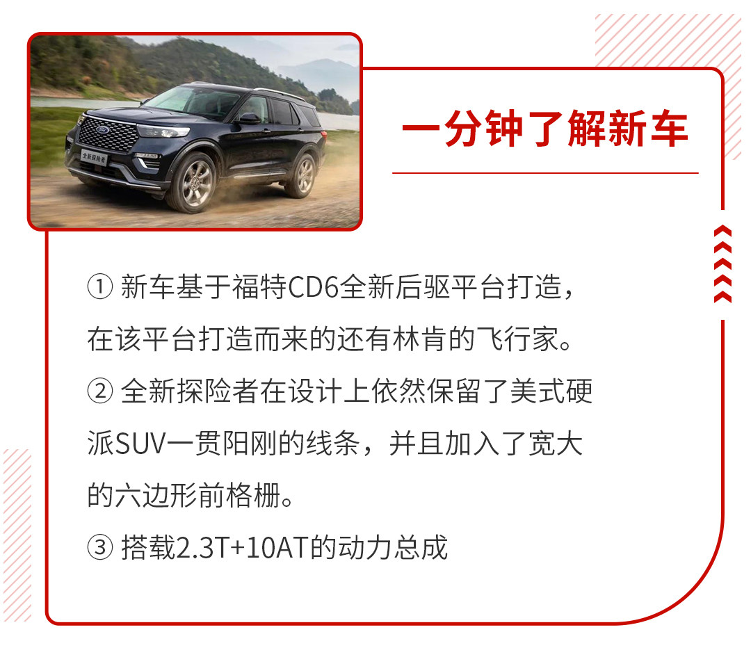 但对于探险者来说,全新换代之后产品力有着质的变化。除了内外设计方面的优化之外,新车基于全新平台打造,在性能操控方面更有自己独到的地方,无论是外观运动套件的装饰,还是动力输出方面。传动效率更高的10速自动变速箱的加入和大量的轻量化设计,相信在燃油经济性上有明显的优化。