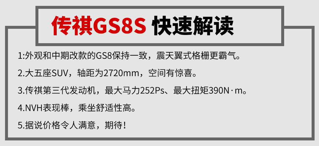 传祺GS8S这款车还未上市,我们就抢先试驾了次顶配的工程样车,虽然说还不是最终上市的版本,但各方面已经非常接近了。拿车的时候教授也从传祺官方人员中频繁听到“运动版GS8、全新家族设计、同级领先空间、超强动力”等字眼,不由让人对这款车多了几分期待。