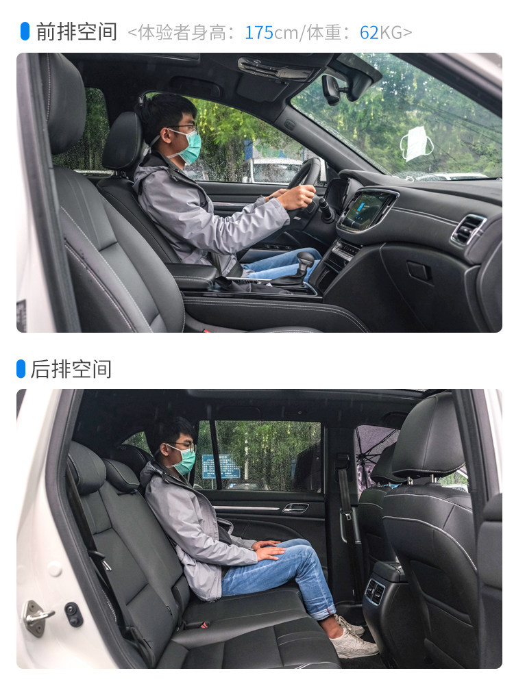 虽然它的轴距只有2720mm,在中型SUV中并不算突出,但实际的乘坐体验让人出乎意料。一个中等身材的小伙(175cm)无论是前排还是后排都有超过1拳的头部空间,后排的腿部空间可以翘起二郎腿了。