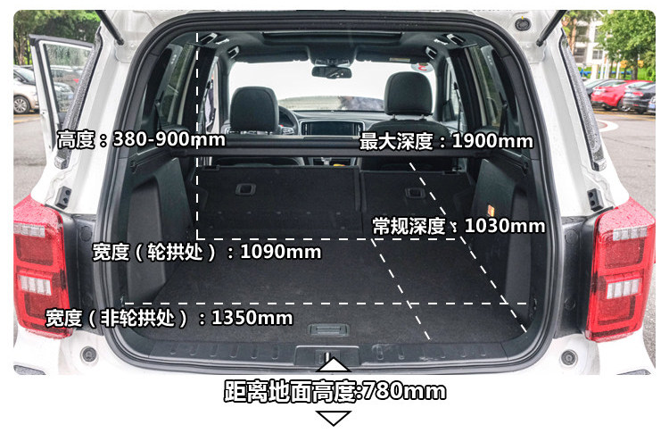 后备厢在5座时的容积为892升,放倒第二排可以扩充至1774升,容积相当可观。后备厢比较规整,容易储存比较大件的物品,可惜后排座椅不能放平,有一定的角度。