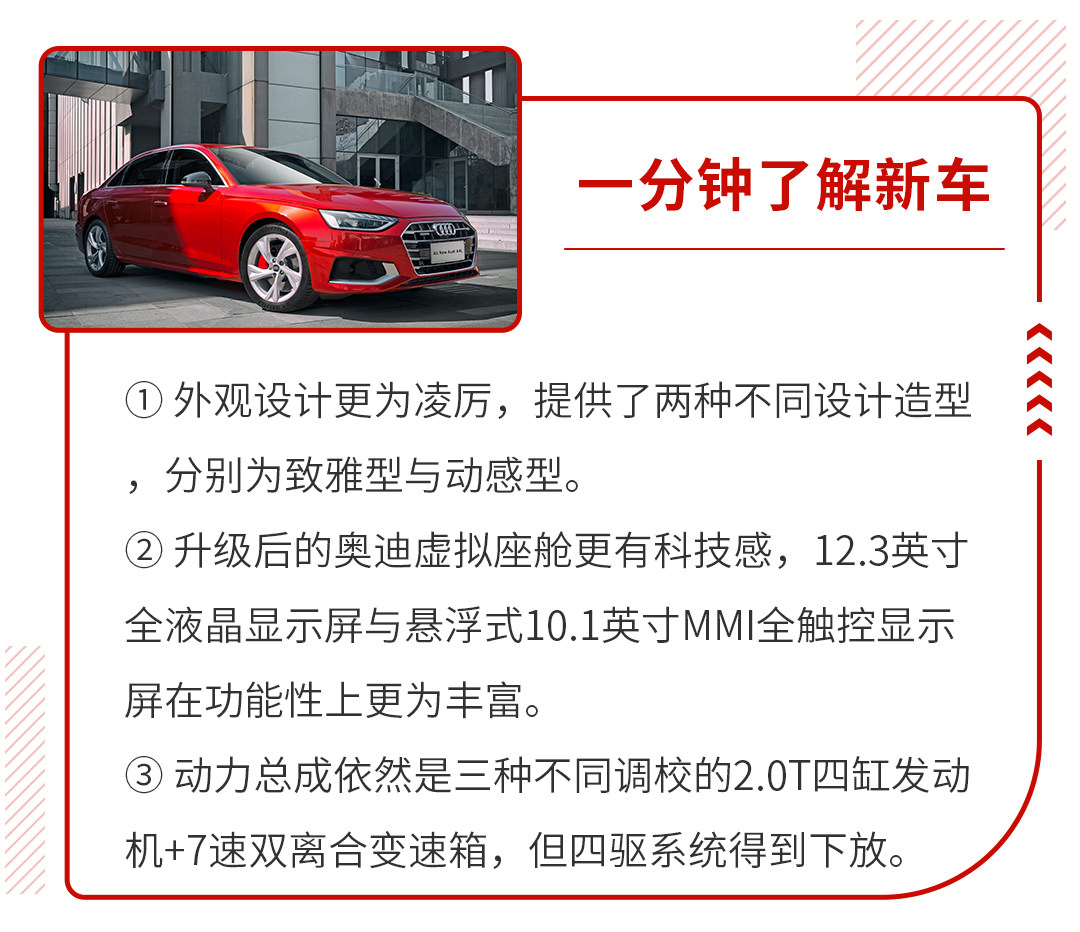 时光拉回2019年,这一年奥迪A4L在国内市场销量超过17万辆,稳坐豪华中型轿车的头把交椅。但从长远的角度来看,竞争对手纷纷革新,全新蜕变的3系以及后来居上的凯迪拉克CT5,竞争情形已不容乐观。于是,奥迪A4L在今年迎来了中期改款。4月10日,奥迪A4L正式上市,新车售价为30.58万-39.68万元,共提供了9款配置车型。动力上搭载了三种不同调校版本的2.0T直列四缸发动机,部分车型匹配四驱系统。