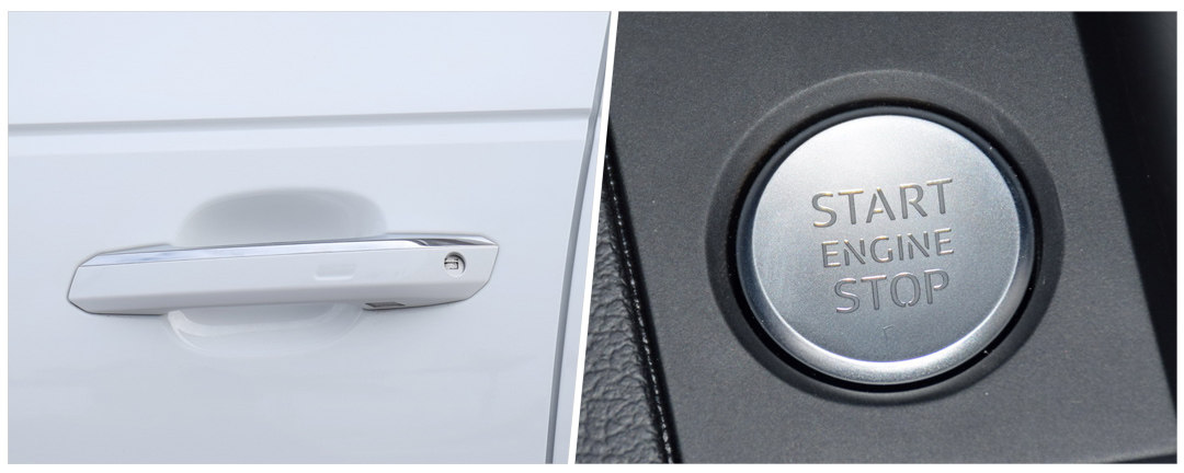 无钥匙启动是指用户来到车辆指定范围内,安全系统确认用户口袋里的钥匙与车辆匹配正确,只需拉动门把手即可解锁车门,免去掏钥匙进行开锁的步骤。而无钥匙启动既上车后把钥匙放在车内或口袋中,可直接按下一键启动着车,同样省去插钥匙的步骤。