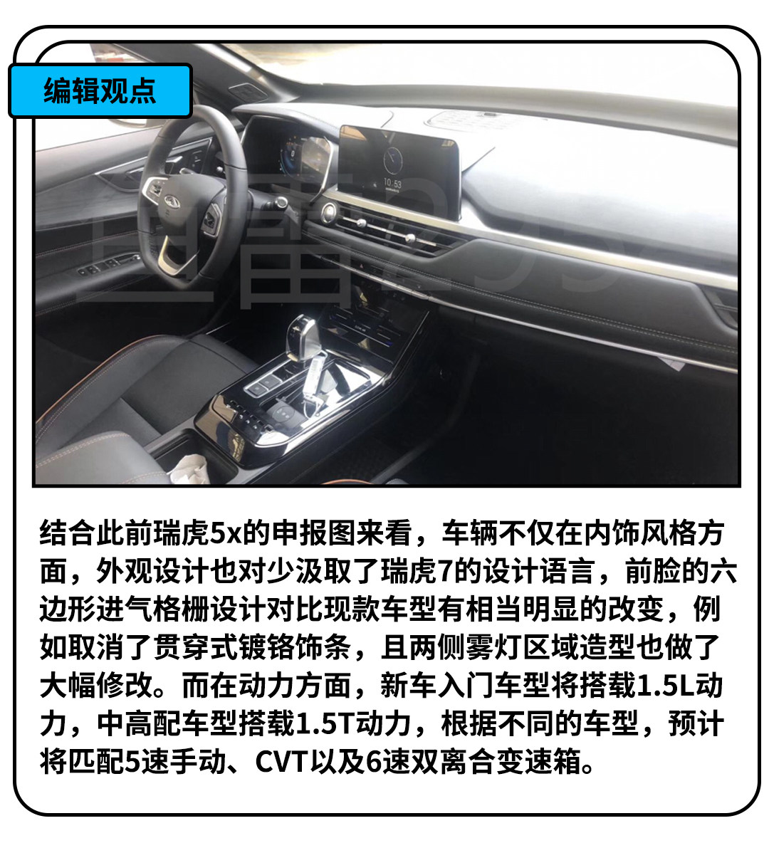 近日,网上曝出了一组新款奇瑞瑞虎5x的内饰谍照图,相较现款内饰设计,全新车型的设计风格更接近于瑞虎7,中控屏改为悬浮设计,且新增了时下比较流行的全液晶仪表,同时空调区域也采用了触控面板,而比较抓人眼球的还是车辆档把更换为了电子档把。新款瑞虎5x在内饰设计上融入了许多近年非常流行的设计元素,看点确实不少。