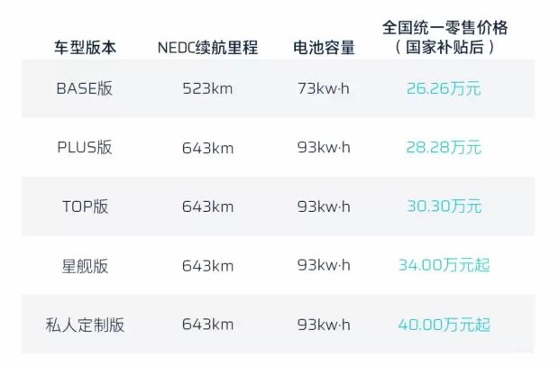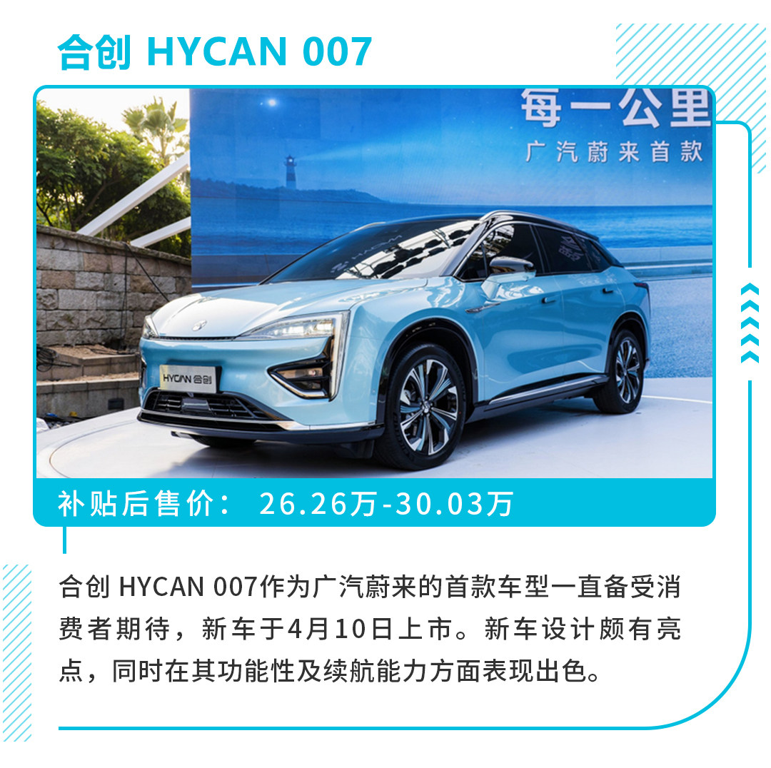 广汽蔚来旗下品牌合创HYCAN的首款纯电动SUV车型——HYCAN 007于4月10日正式上市。该车于2019年末已正式亮相并公布预售价,新车定位为中型纯电动SUV,其NEDC工况下续航里程达到643km。该车型共提供3款配置可供选择,补贴后售价为26.26-30.3万元。同时,提供星舰版及私人定制版可选,售价分别对应为34.00万元起和40万元起。