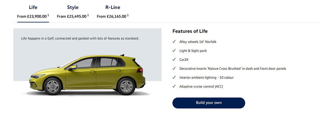 买买君从大众英国官网看到:2.39万欧元起售的Life版,搭配了ACC自适应巡航,16寸轮毂,远程手机互联,动力上是1.0T+手动。科技配置挺不错,但动力方面不太符合国内的用车大势了。