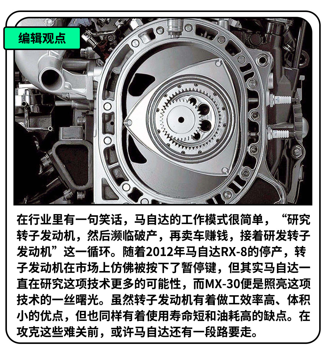 说起马自达,很多人都会想到现在的创驰蓝天、魂动设计,但这些在马自达这家车企中只不过是“副业”,其实他们的老本行是研发转子发动机。据海外市场流出消息,马自达正在考虑沿用马自达2概念车的思路,为首款纯电动车MX-30加入可作为增程器的转子发动机。MX-30电池组容量仅为35.5kWh,续航里程约为209公里,在如今的电动车市场几乎毫无竞争力,但配备一台排量为0.333L的单转子发动机后,续航有望得到进一步提升。