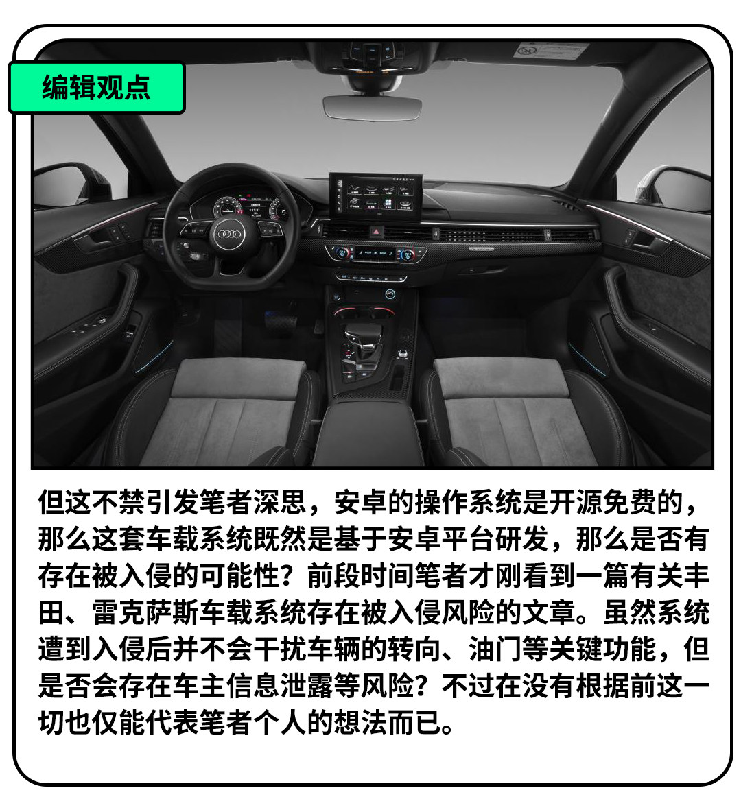 奥迪在4月10日刚刚引来自己的中期改款,而相较于改款前车型,全新奥迪A4L除了取消1.4T车型外,最大的区别就在于搭载的MMI信息娱乐系统进行了优化。而全新的MMI系统是基于安卓平台为中国消费者研发,可以无缝集成手机中使用的应用程序和服务,微信小程序、天猫精灵语音助手支持个性化定制等,都确实非常贴合中国消费者的使用习惯。