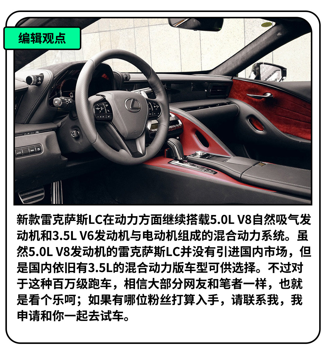 近日,雷克萨斯官方公布了雷克萨斯LC车型的官图,新车相较旧款在设计上虽然没有做明显改变,但是新增了Cadmium Orange(镉橙)和Nori Green Pearl(诺里珍珠绿)两种外观配色,而内饰也增加了Flare Red(闪光红)配色。并且值得注意的是新款LC通过对后悬架下摆臂、弹簧以及轮圈等处的调整,新车共减重10kg,加上电子减震器的加持,驾驶体验应该会有比较明显的提升。