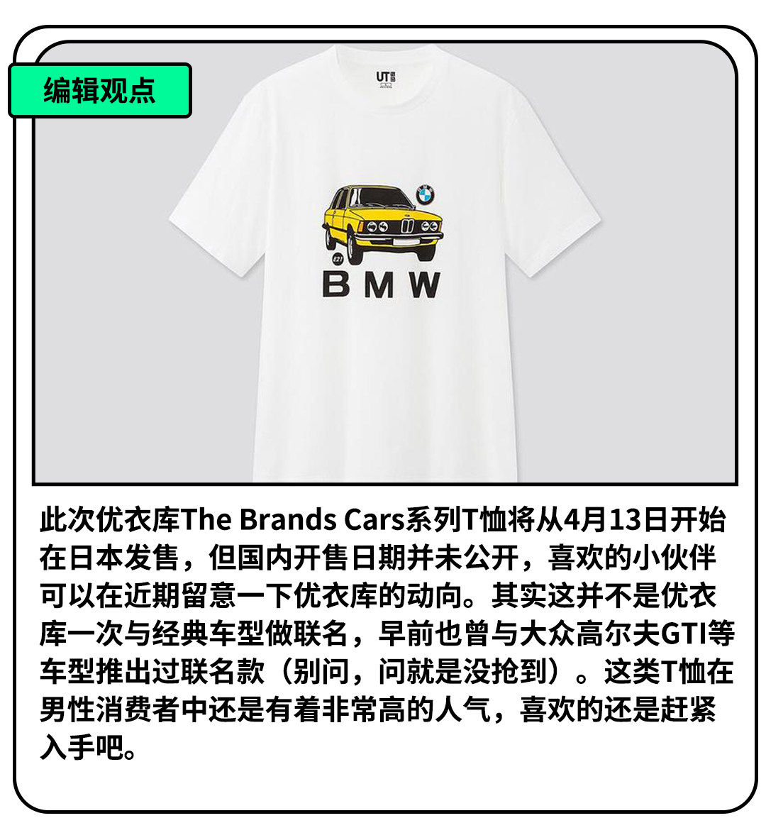 随着气温渐渐回升,又到了该买夏装的时候,而“联名大厂”优衣库又与许多汽车品牌联名,推出了在全球都有着极高人气的经典车型印花T恤——The Brands Cars系列。这次联名设计涉及宝马、阿尔法·罗密欧、大众3个品牌,共推出8中款式,其中涉及联动的经典车型分别为宝马3系(E21、E30);阿尔法·罗密欧的Giulietta、Giulia和Spider;以及大众的甲壳虫和Karmann Ghia。