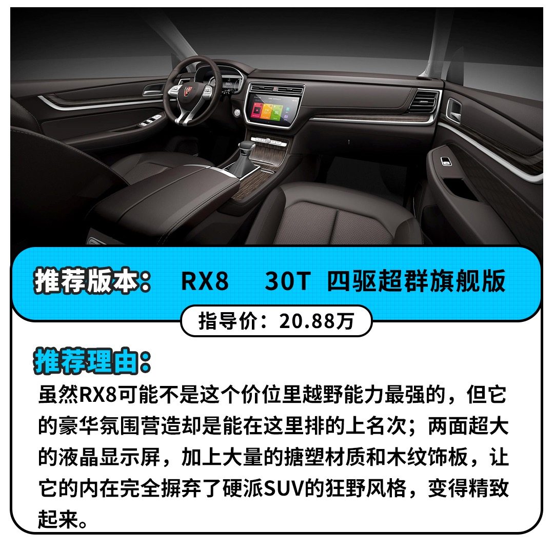 RX8在这个圈子里的名气虽没有H9大,但其本身的产品力却不容忽视;非承载式的车身加上前双叉臂、后五连杆整体桥式的悬挂,让它成为了少有的入门价低于20万的硬派中型SUV。