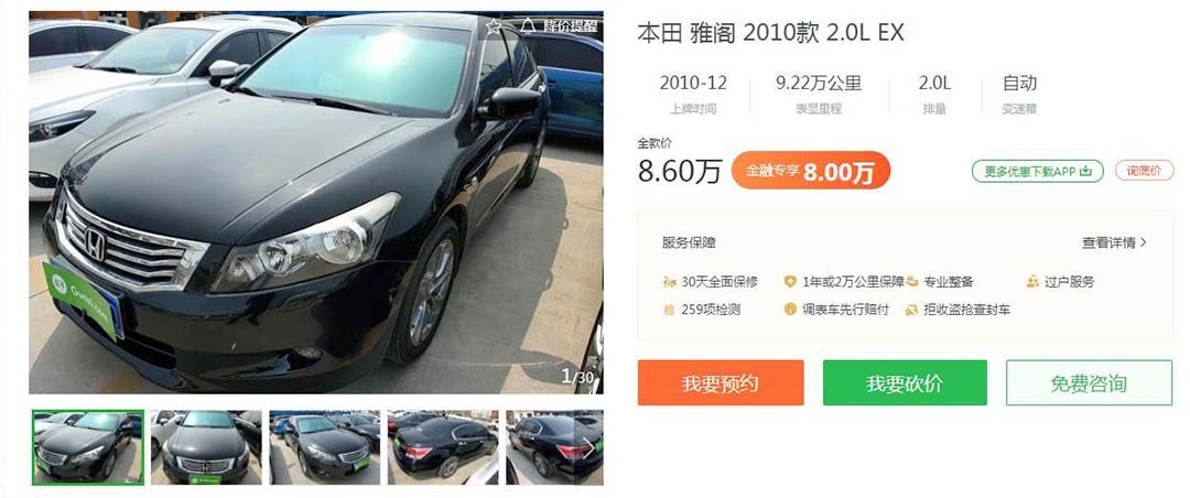 结果还是惊人的相似,通过对比三家二手车平台之后,我们发现,同样是10年车龄的雅阁2010款 2.0L EX,在车况良好的情况下,可以卖到8.2-8.7万元(根据地区、车况、里程数价格存在差异),雅阁的保值率可见一般。