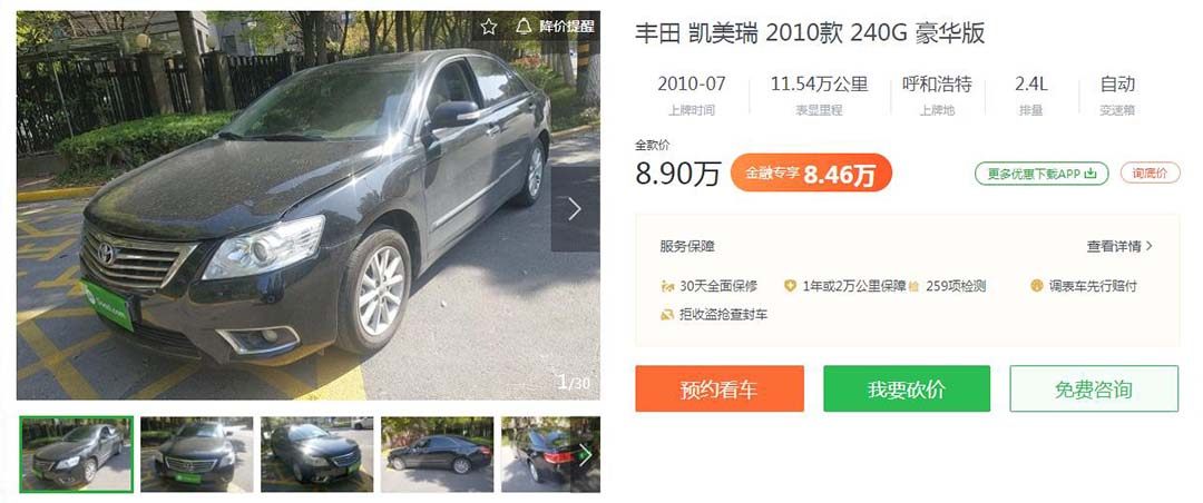 在保值率方面,同为日系的凯美瑞和雅阁有得一比,当年新车售价24.6万元的凯美瑞2010款240G豪华版在10年后还能卖出8.2-9.3万元。