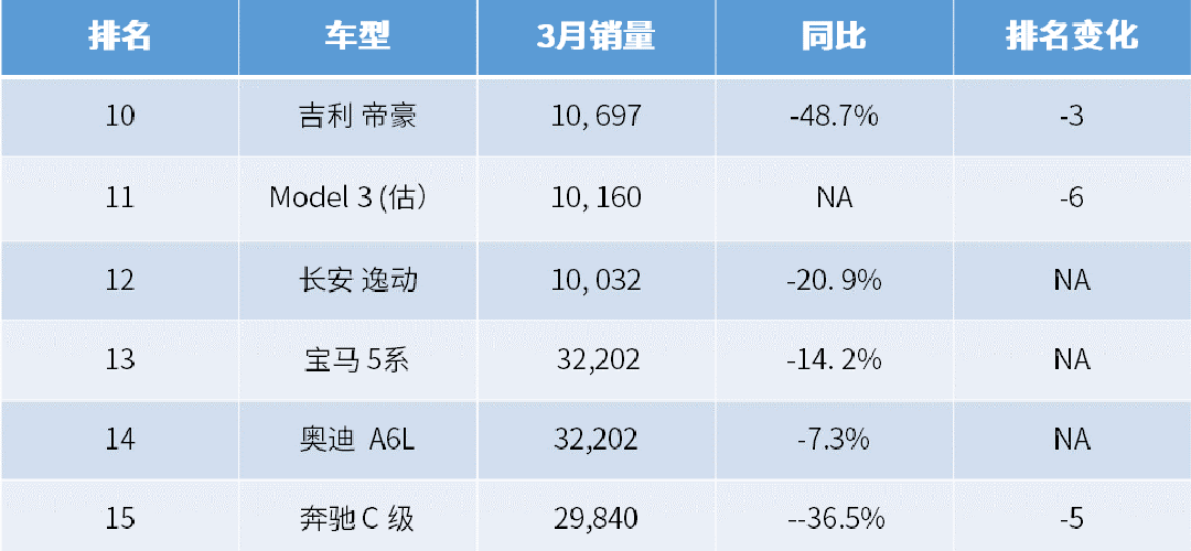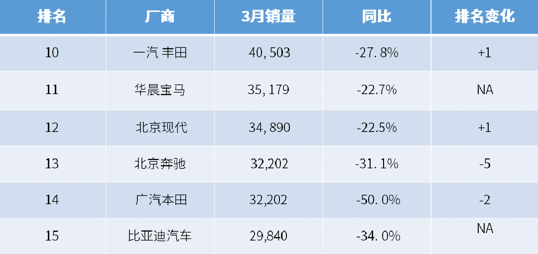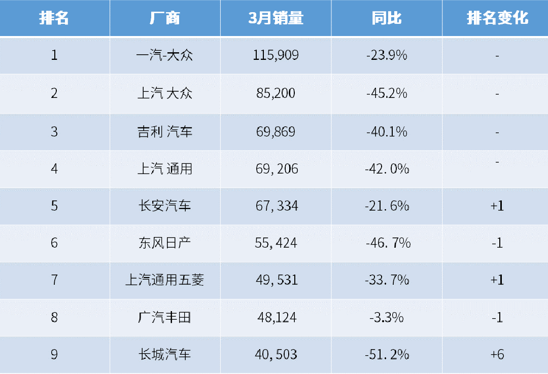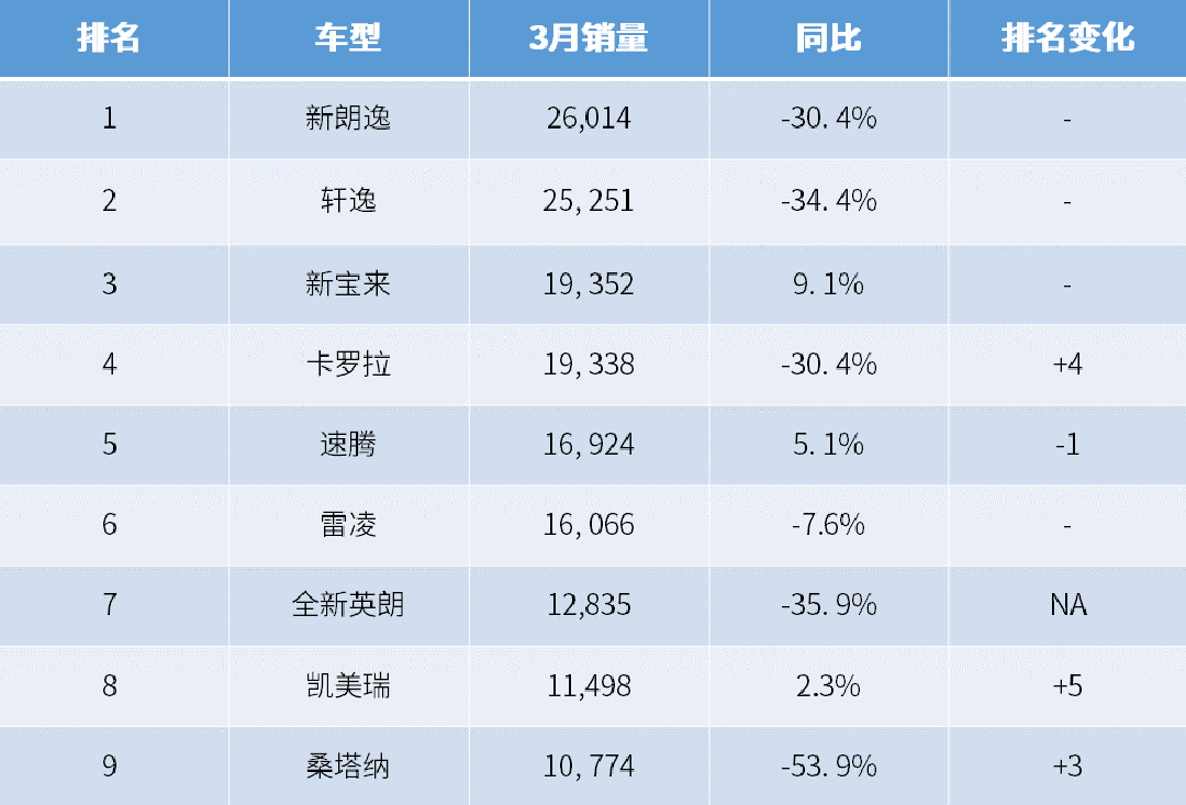 值得一提的是,同比上年3月销量,大众宝来、速腾以及丰田凯美瑞整体变化不大,甚至略有上升,并未受到这特殊时期的影响;但也或者因为上年基数较低,说明这几款车型在车市恢复元气后,能有进一步的销量提升。