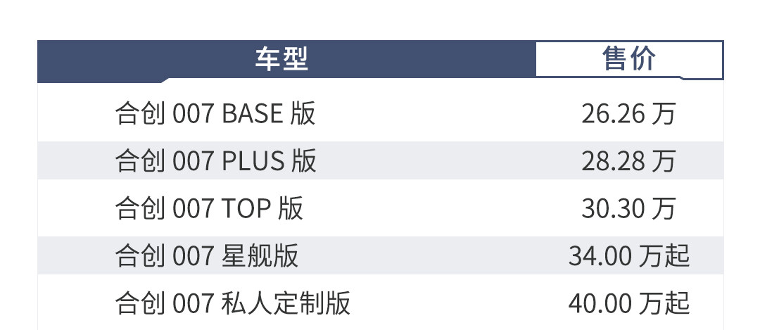 作为广汽蔚来合资的全新电动汽车品牌,合创首款纯电中型SUV已经正式上市,新车共提供了5款车型,其中BASE、PLUS和TOP三个版本补贴后售价为26.26-30.3万元,而星舰版与私人定制版限量500台,价格分别为34万起和40万起。