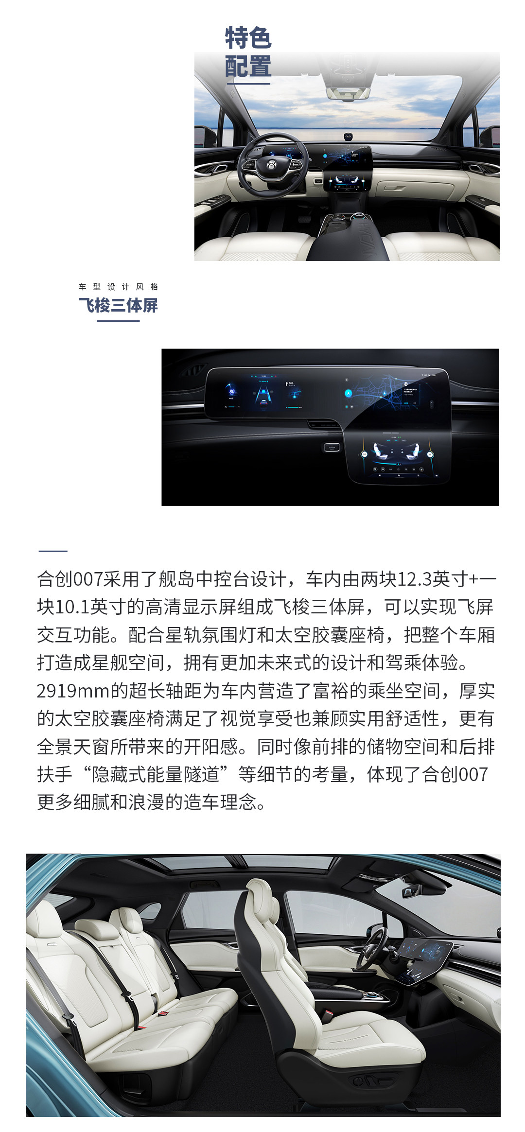 内饰经过重新设计的合创007引入了飞梭曲面三体屏的概念,在车内营造了极高的未来科技感,除了可以利用手机隔空投屏外,智能领航员——小CAN的加入也让车厢多了一丝情感的温暖。