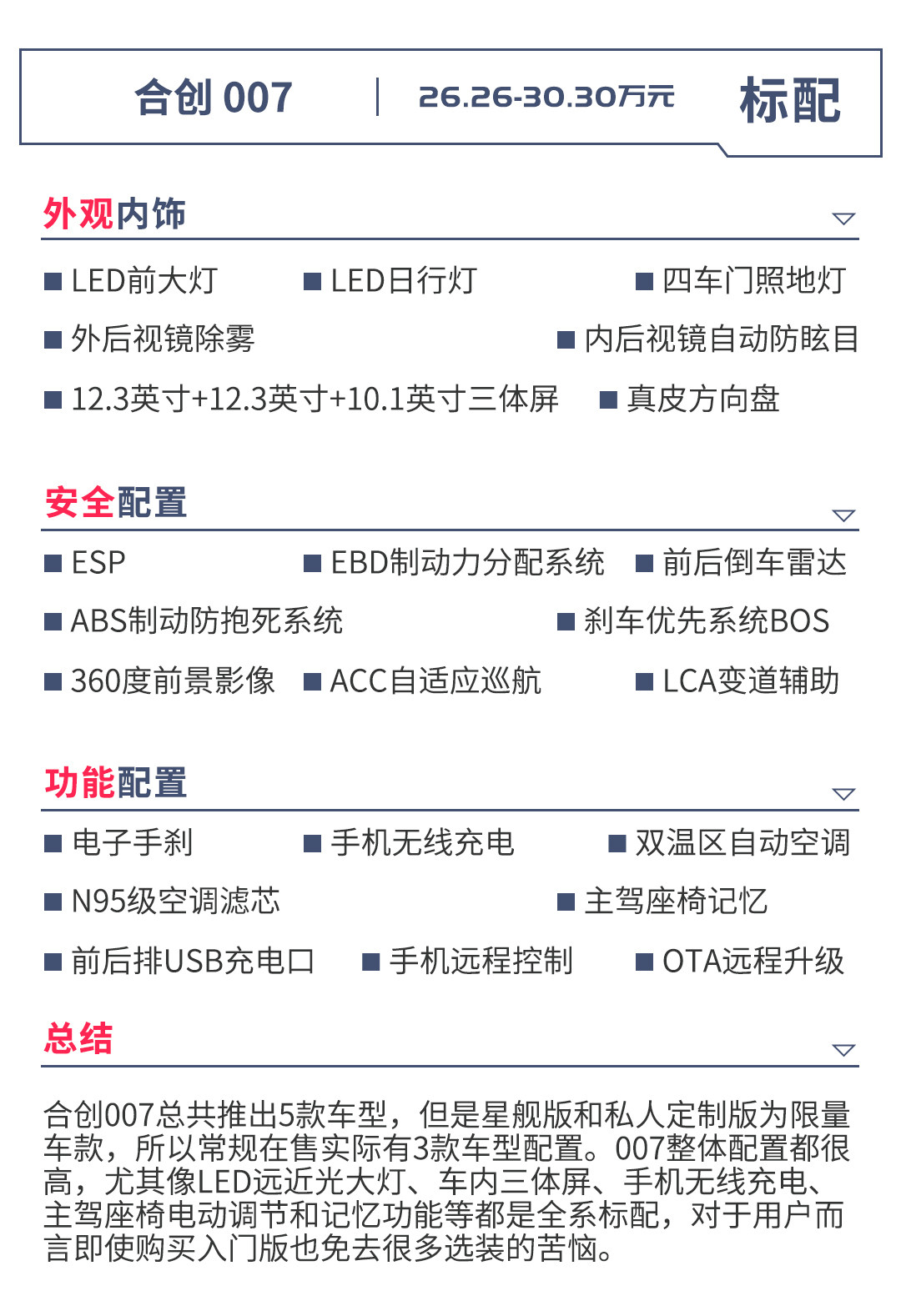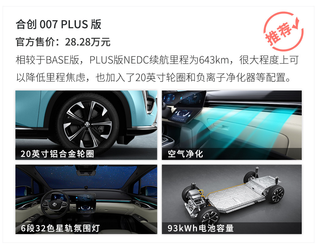 合创007除去两款限量版车型之外,三款基础车型的配置都不低,很多配置都是全系标配,最大的配置差异是电池组容量的不同。