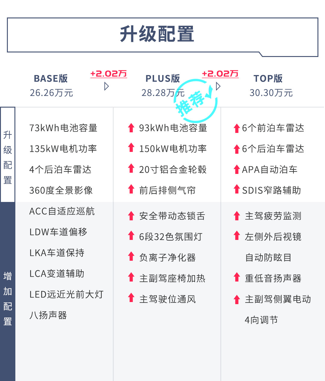 在PLUS版本上除了缺失APA自动泊车、SDIS窄路辅助和疲劳监测外,L2+级的驾驶辅助系统是全系标配,外观和舒适性配置更是直接看齐TOP版,之间的配置差距并没有很大,所以在保证长续航出行的前提下,PLUS版本已经能满足绝大多数用户的选购需求。