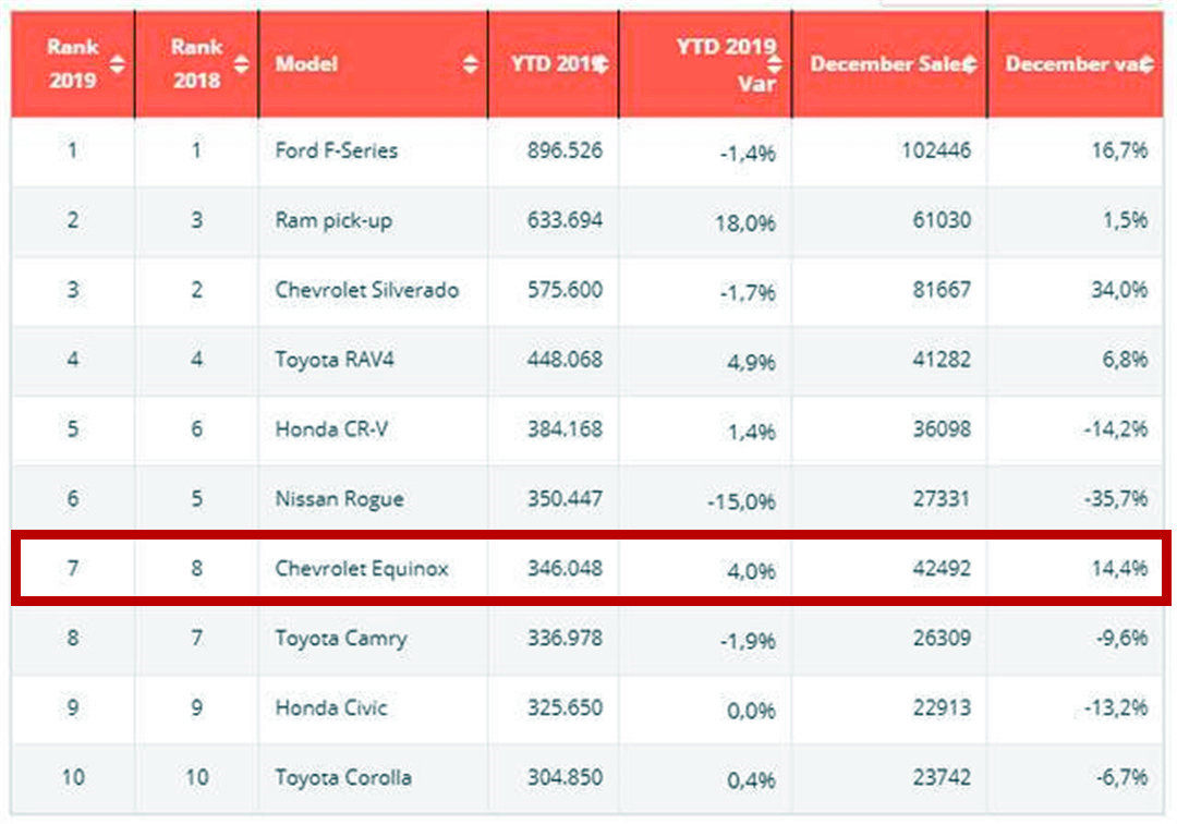 2019全美销量前十车型排行榜