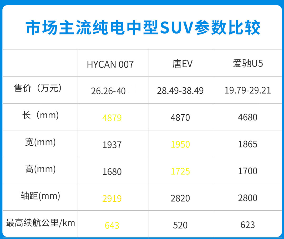 从图表可以看得出,HYCAN 007与一些主流纯电中型SUV尺寸相比,不相上下,甚至是超越他们。
