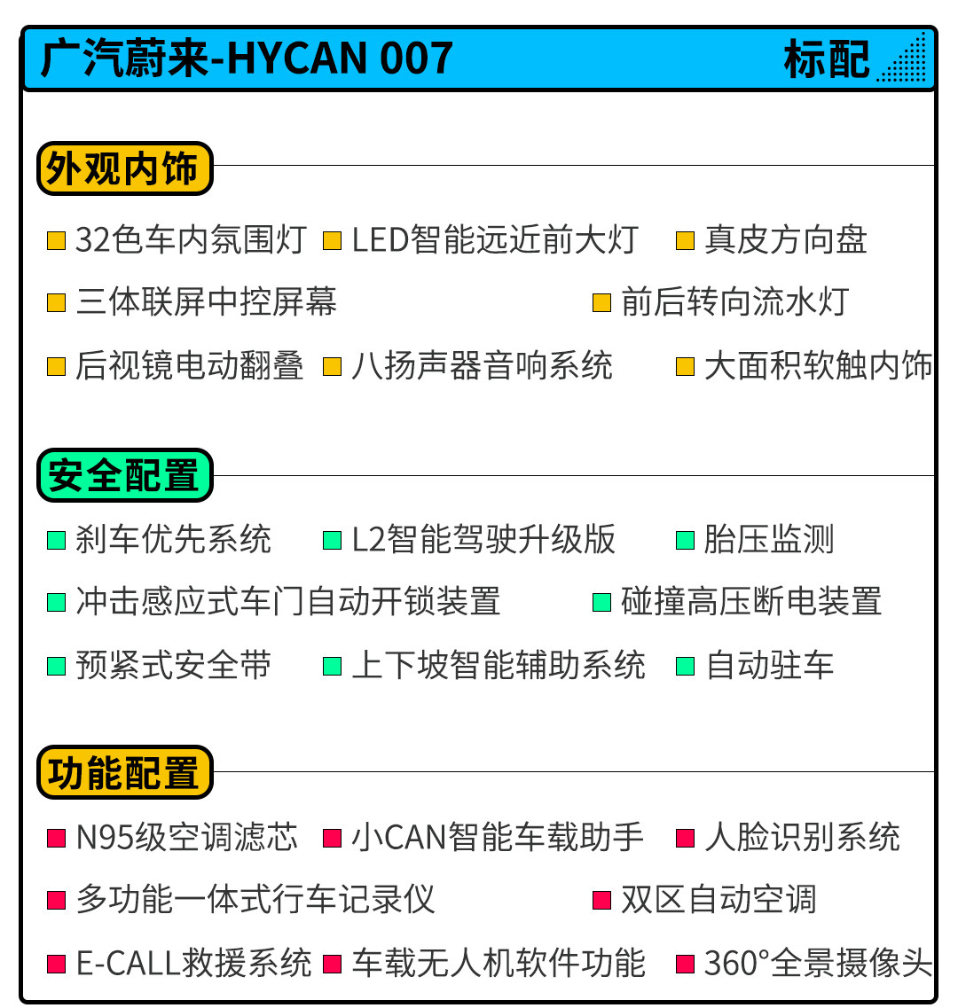 在智能驾驶辅助方面,HYCAN 007全系搭载了L2及智能驾驶辅助升级版,加入了同级别领先的环境感知传感器矩阵,其拥有24颗毫米波雷达及摄像头组件,可以感知车内活体的运动特征以及车辆周围情况,而且具有行车记录仪等功能,是实现生命安全守护系统和自动泊车,ACC自动巡航系统功能所需的必备硬件。