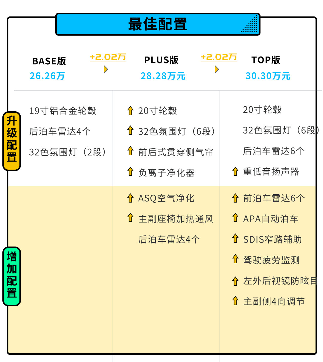 而PLUS版比BASE版贵了2万元左右,但多了一些功能配置和一些安全配置,增加车内侧气帘,车内PM2.5过滤装置,空气净化器,主副座椅加热及通风,20寸轮毂等配置,更重要的是实在在是增加了100多公里的车辆续航里程。