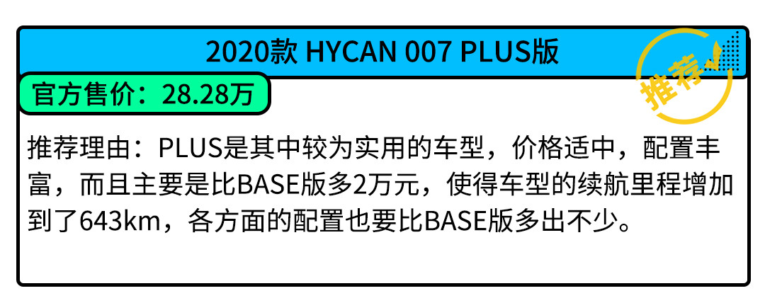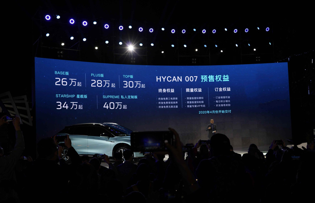 HYCAN 007推出了三款车型,分别是BASE版,PLUS版,TOP版,还特别推出私人定制程度更高的,满足用户个性化追求的星舰版和私人定制版,分别是34万元起和40万起。