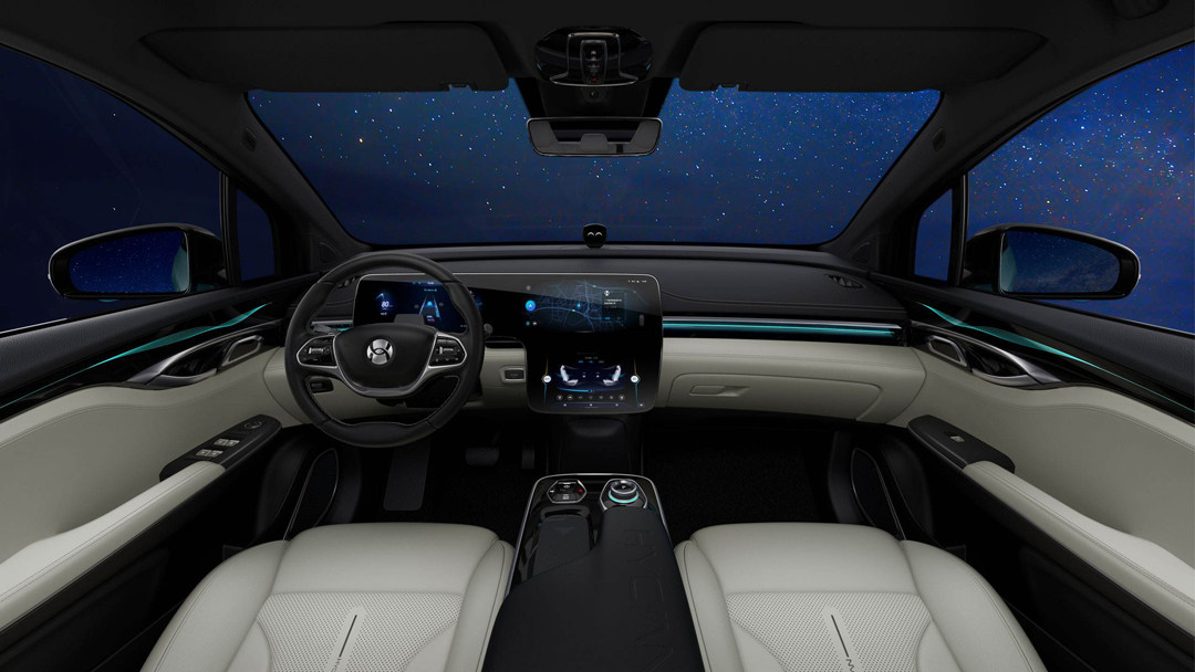 HYCAN 007在内饰设计采用了类似科幻电影里“太空战舰”的“星舰空间”设计理念,将其整个车内空间设计得极其具有科技感,并实际运用在车内的配置和细节上,星轨式车内氛围灯,舰岛式中控台,太空胶囊座椅等科幻式设计。