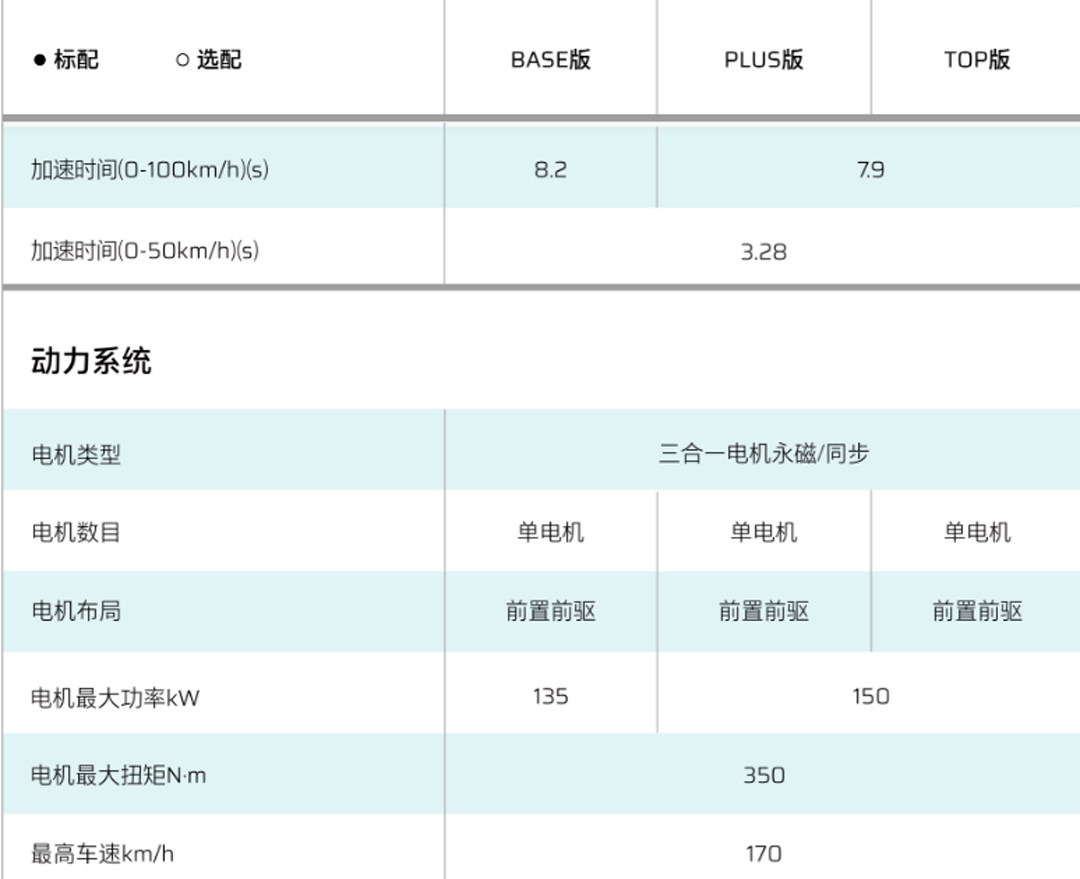 其中,低配版车型只有一款,就是BASE版,也是此系列中唯一一款续航里程为500km级别车型,其余均为600km级别的车型。