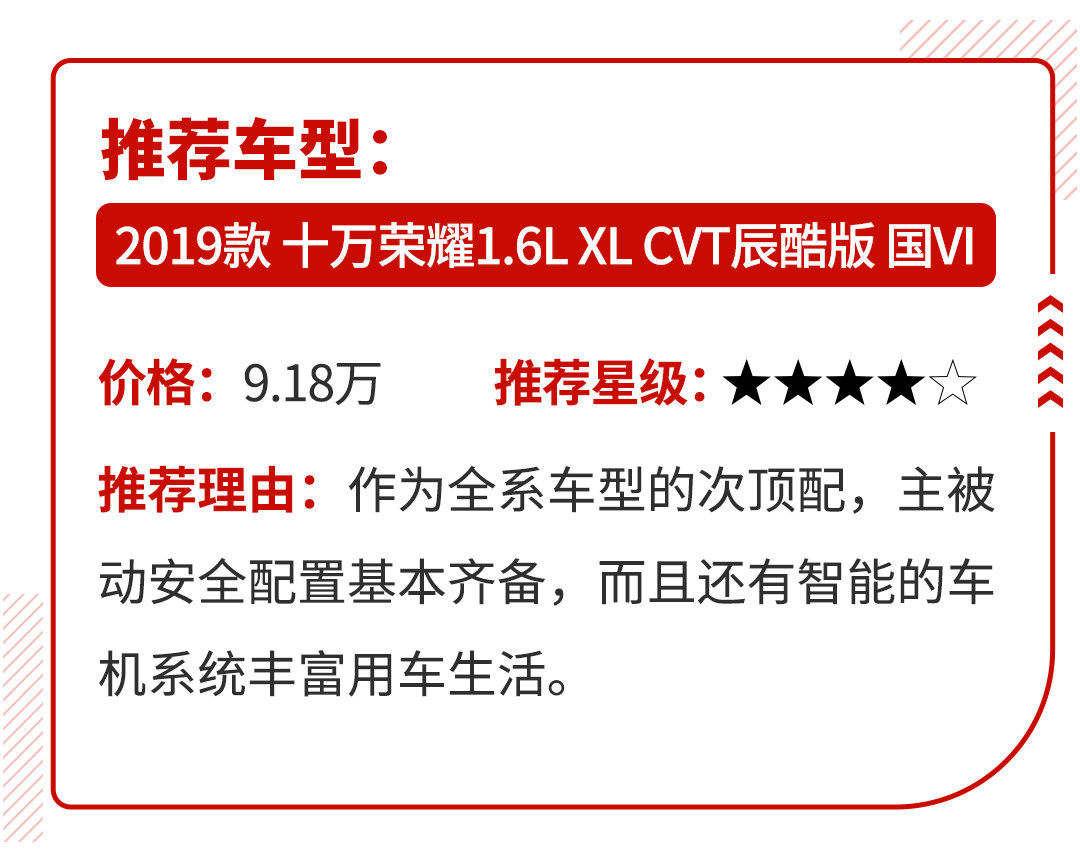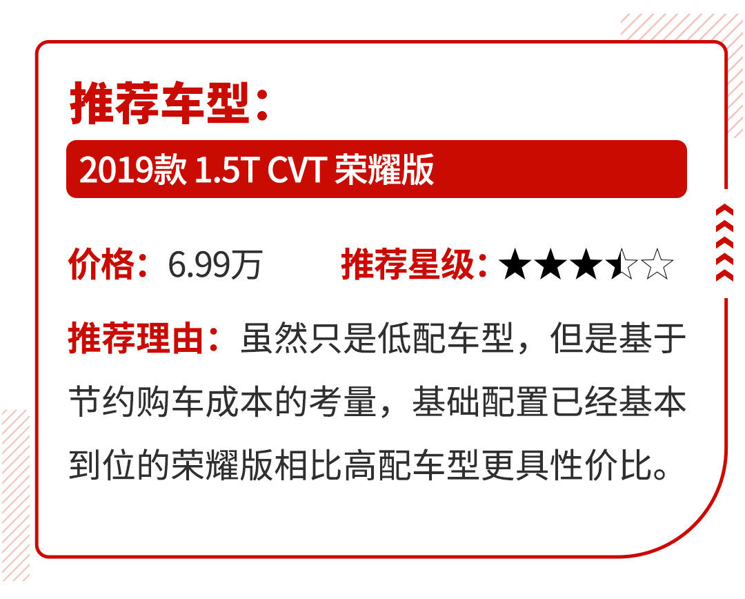 全系最值得购买的车型当属指导价为6.99万元的1.5T CVT荣耀版。虽然只是低配车型,但是价低并不代表配置低,除远近LED大灯、8英寸液晶屏、ESP电子稳定系统、后排出风口等全系标配的配置以外,再在自己手动版本的基础上多花2万就能换来一具1.5T发动机、CVT无级变速箱、定速巡航等一系列能大幅度提升日常行车舒适性、安全性、便利性的实用配置。