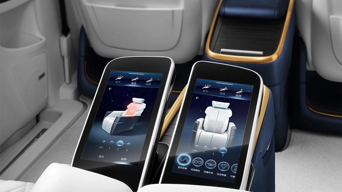 而后排座椅中间有两块独立的触控屏,它主要用于调节座椅和控制功能,在配置上提供座椅加热、通风、腿托加热以及带有8种模式的按摩功能等,而在触控屏前方还提供了手机无线充电功能。