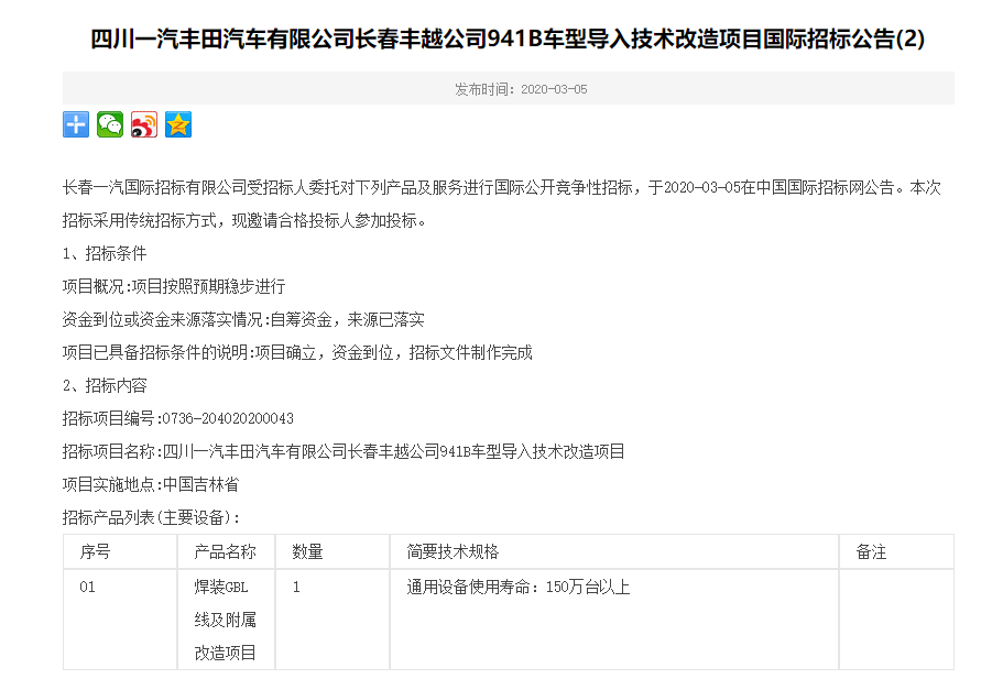 和大家回顾一下教授之前给大家搜集到关于全新一代HARRIER引入国产的资讯。四川一汽丰田汽车有限公司长春丰越公司就对代号为941B车型导入技术改造项目进行公开招标。而941B的代号代表的是未来丰田引入国内进行国产销售的全新一代HARRIER车型。