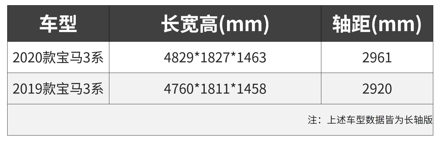 现款宝马3系长轴版相比上代车型,尺寸有所增加,从下面的对比可以看到,长宽高分别增加了69/16/5mm。车身尺寸的增加对于性能和操控的影响,不用买买君多说吧?而这更释放出宝马3系偏向家用和舒适性的信号。