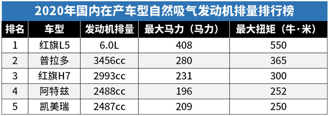 通常来讲,大排量自吸机似乎都是国外品牌的专属,尤其以跑车或美式肌肉车为主,国产车似乎都与大排量无缘,然而在“2020年国内在产车型自然吸气发动机排量排行榜”中,却呈现不同的景象,国产品牌红旗L5以6.0L的排量遥遥领先其他车型。