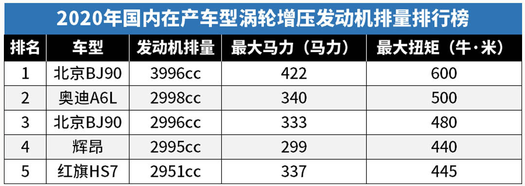 回到文章的话题,北京BJ90搭载的这台4.0T V8发动机无疑是目前在国内生产的车型中,排量最高的涡轮增压发动机,当然动力也是最强的,达到了422马力,甚至比搭载在红旗L5上的那台6.0L发动机还要猛。