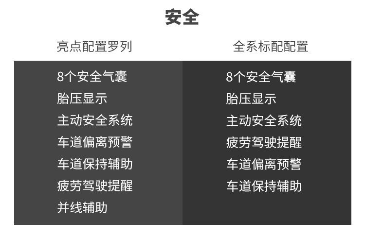 飞行家也是一款相当安全的大型豪华SUV,它全系标配了8个安全气囊以及胎压显示、主动安全系统、疲劳驾驶体型、车道保持辅助等实用主动安全配置,在驾驶辅助功能方面也相当丰富,全速自适应巡航、5种驾驶模式以及陡坡缓降、交通标识识别等功能都有助于让驾驶变得更轻松。