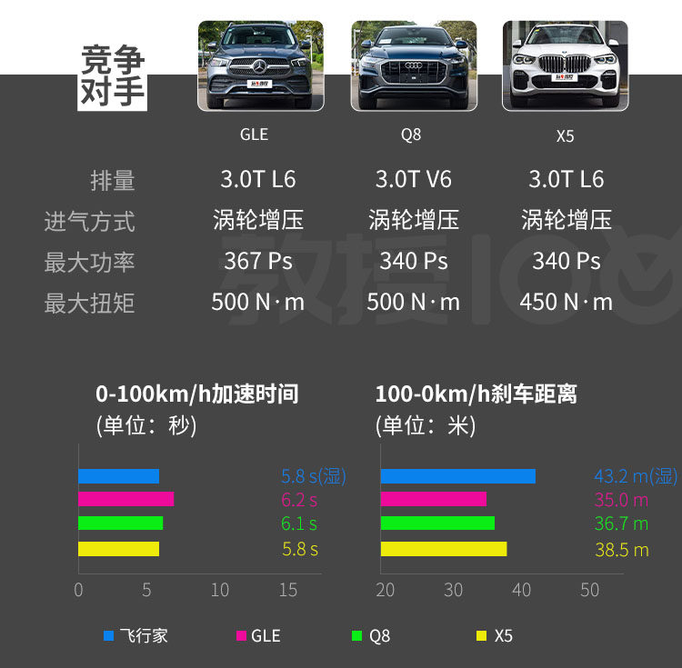 在最新的10AT手自一体变速箱辅助下,飞行家在雨后潮湿的测试场地做出0-100km/h 5.8秒的优秀成绩,需要说明的是,该测试是在雨天湿滑路面进行,若是干燥路面,相信测试成绩会更出色。