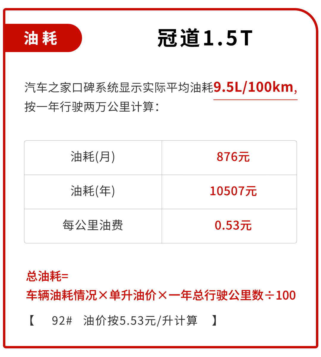 由于冠道有着非常庞大的车身重量,在油耗方面自然就不会有特别出色的表现了,不过9.5L/100km的油耗对于一款中型SUV来说还是在可接受范围内,平均下来每公里需要0.53元,在这个级别里算是比较出色的表现了。