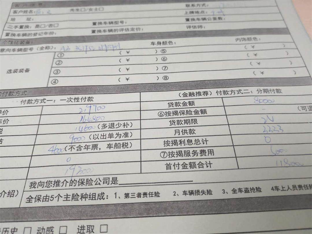 再来看看奥迪A3。买买君询问的是奥迪A3 1.4T时尚型(Limousine 35 TFSI),这款车的指导价是21.97万元,而店内车价为164800,优惠超过了5万元,最后全款落地193000元。此外,奥迪有两年免息的政策,贷款8万的话,首付118000元就能落地了。