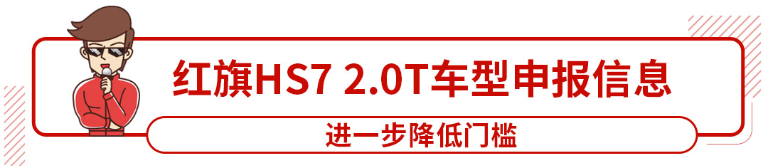 作为中大型SUV,早期上市的HS7仅提供3.0T(50TD)+V6动力可选,而近日工信部发布了红旗HS7的2.0T(45TD)申报信息,这意味着搭载2.0T发动机的红旗HS7即将推出。新车尺寸为5035/1989/1778mm,轴距为3008mm。外观方面变化不大,前脸继续采用直瀑式进气格栅,中央格栅条采用红色涂装;尾部除了动力标识的变化,其余和现款一致。配置方面2.0T将提供车门镀铬饰条和19/20英寸轮圈可选。动力上将搭载2.0T直列四缸发动机,最大功率达248马力。现款红旗HS7 3.0T的起售价为34.98万元,而本次新增的2.0T版本将会降低车型门槛,同时HS5 2.0T顶配车型售价为24.98万元,因此新增车型能更好的弥补25-35万元之间的市场空缺。