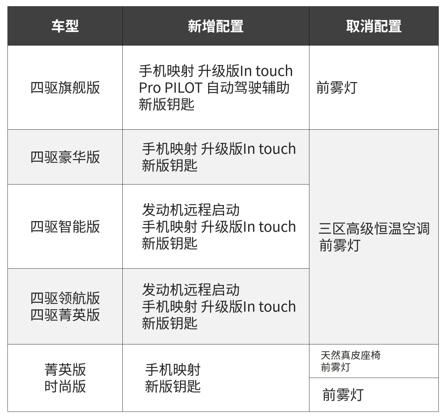 相较于在售车型,新车将手机映射功能全系标配,并且支持苹果CarPlay以及百度CarLife。同时,车内USB接口由两个USB变为一个USB+一个Type C接口。此外,四驱版中低配车型新增发动机远程启动功能,同时全部四驱版车型升级了InTouch功能,进一步支持一系列在线应用。