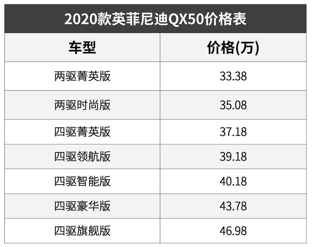 2020款英菲尼迪QX50定价为:33.38-46.98万元,这和老款的定价策略分毫不差。