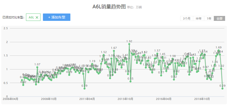 现款A6L刚上市来看,并没有获得太好的市场反响,其对手宝马5系以及奔驰E级的实力非常强劲。但从2019年下半年开始,其销量数据开始回暖,甚至创下了奥迪品牌所有车型的单月的销量纪录。